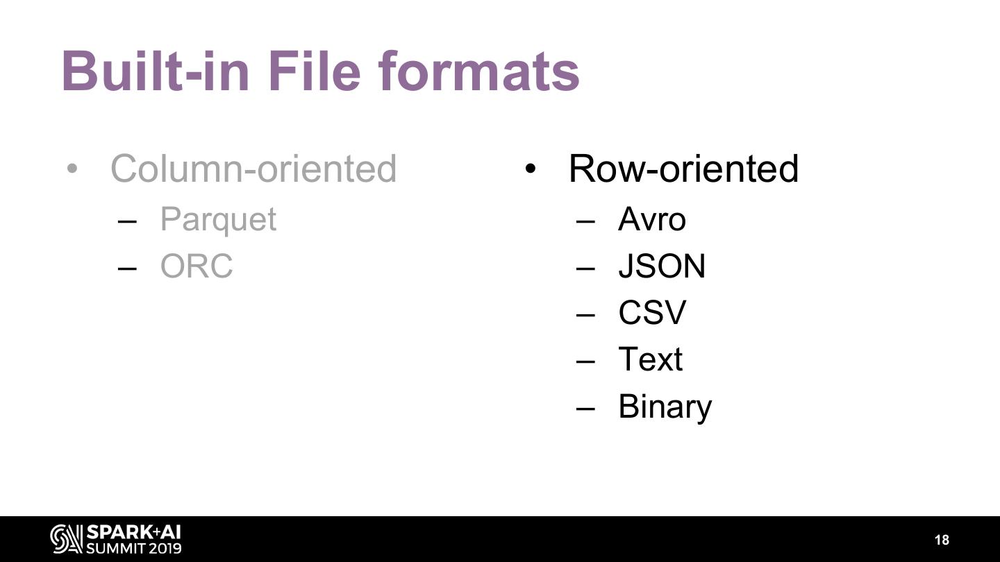 18 .Built-in File formats • Column-oriented • Row-oriented – Parquet – Avro – ORC – JSON – CSV – Text – Binary 18