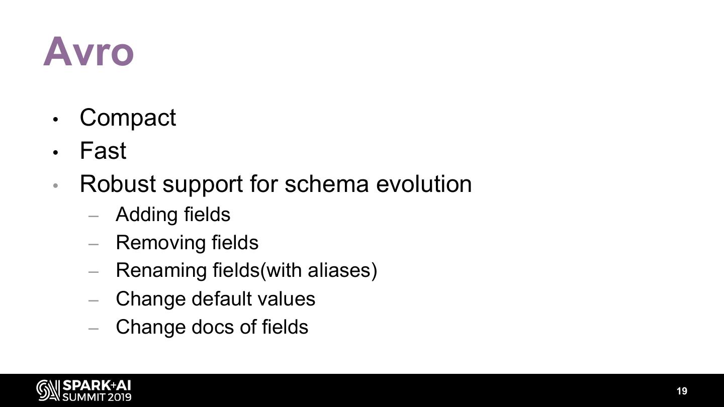 19 .Avro • Compact • Fast • Robust support for schema evolution – Adding fields – Removing fields – Renaming fields(with aliases) – Change default values – Change docs of fields 19