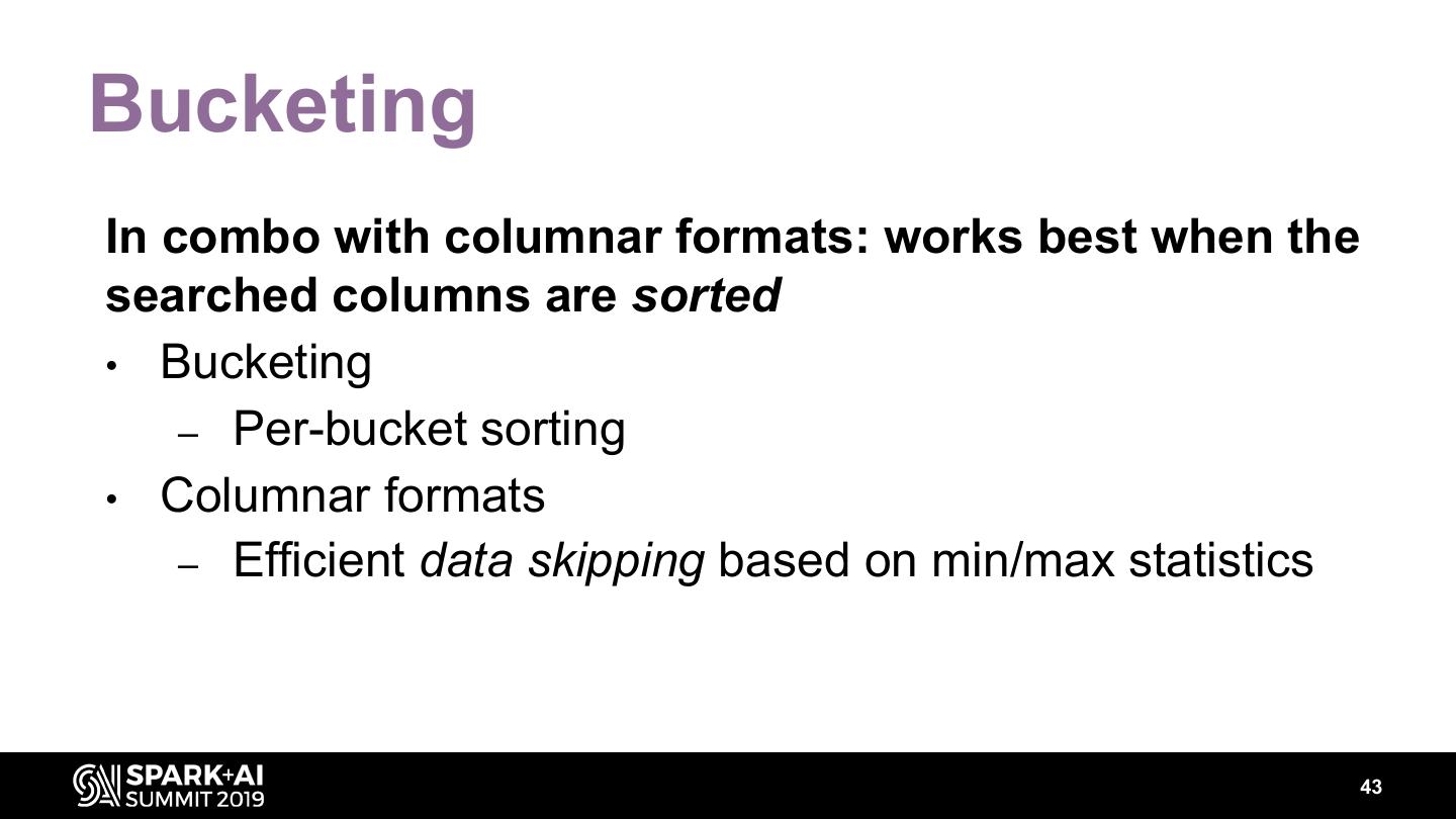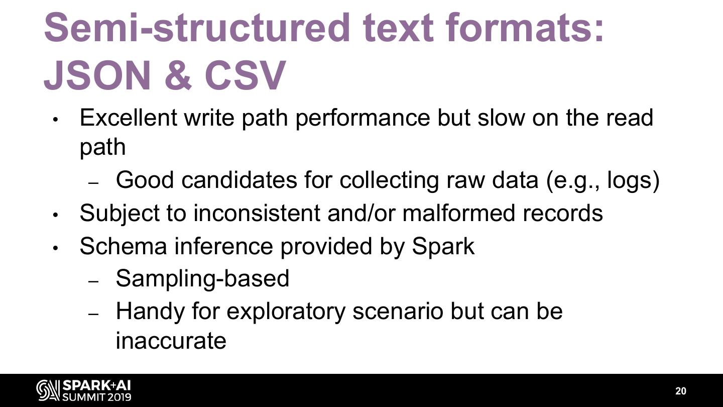 20 .Semi-structured text formats: JSON & CSV • Excellent write path performance but slow on the read path – Good candidates for collecting raw data (e.g., logs) • Subject to inconsistent and/or malformed records • Schema inference provided by Spark – Sampling-based – Handy for exploratory scenario but can be inaccurate 20