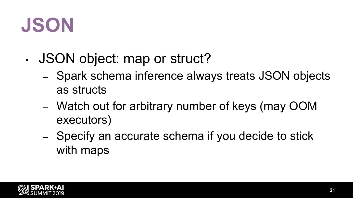 21 .JSON • JSON object: map or struct? – Spark schema inference always treats JSON objects as structs – Watch out for arbitrary number of keys (may OOM executors) – Specify an accurate schema if you decide to stick with maps 21