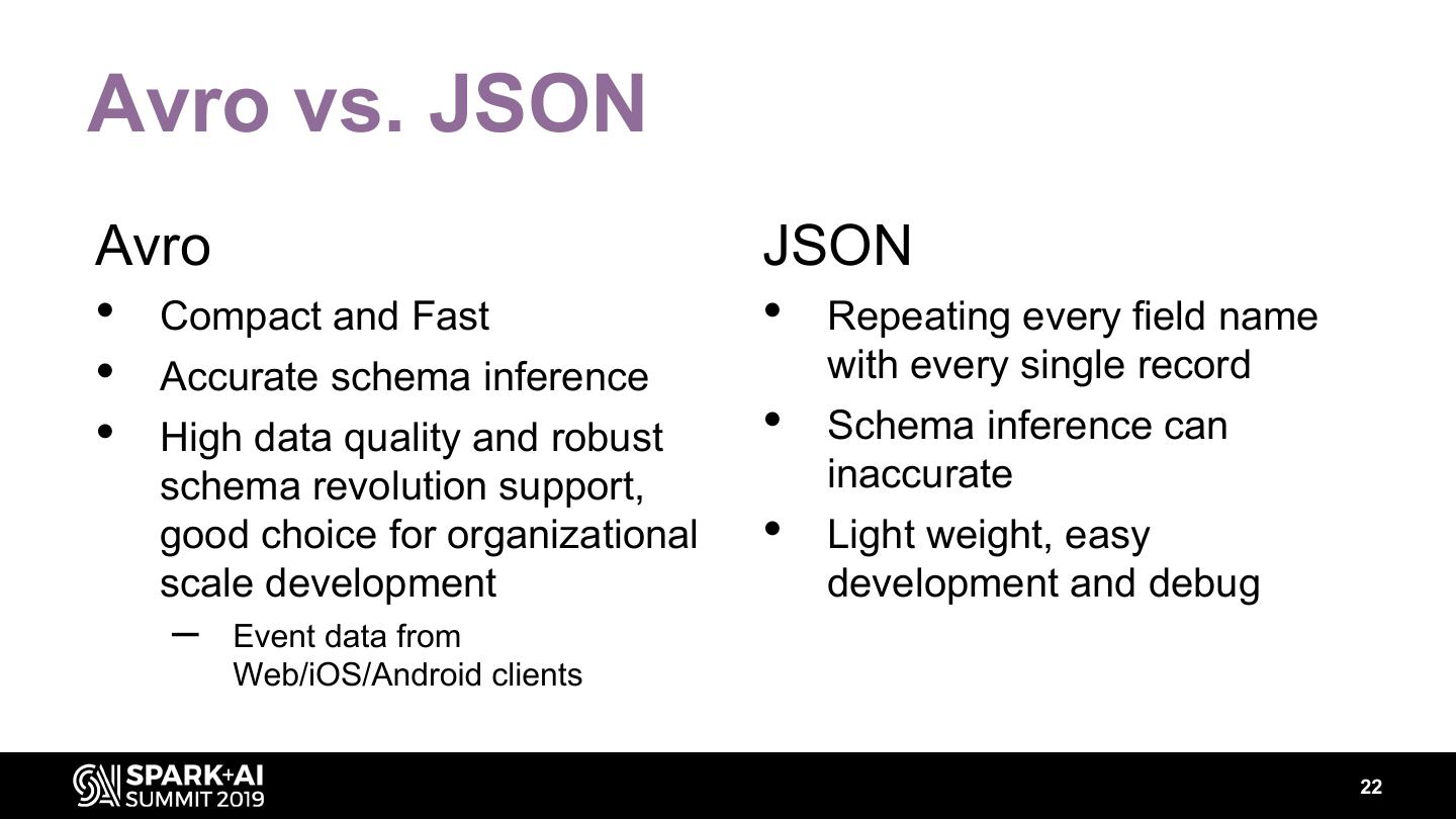 22 .Avro vs. JSON Avro JSON • Compact and Fast • Repeating every field name • Accurate schema inference with every single record • High data quality and robust • Schema inference can schema revolution support, inaccurate good choice for organizational • Light weight, easy scale development development and debug – Event data from Web/iOS/Android clients 22