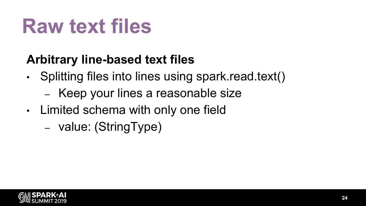 24 .Raw text files Arbitrary line-based text files • Splitting files into lines using spark.read.text() – Keep your lines a reasonable size • Limited schema with only one field – value: (StringType) 24