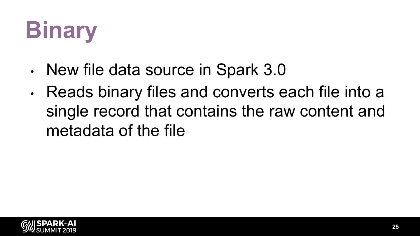 25 .Binary • New file data source in Spark 3.0 • Reads binary files and converts each file into a single record that contains the raw content and metadata of the file 25