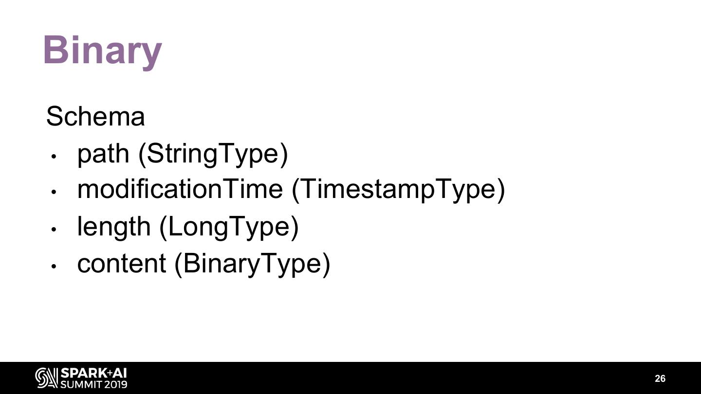 26 .Binary Schema • path (StringType) • modificationTime (TimestampType) • length (LongType) • content (BinaryType) 26