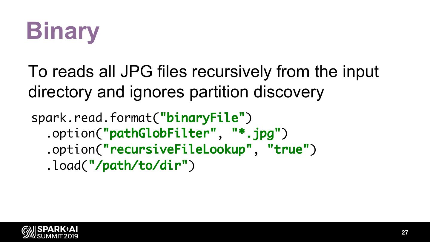 27 .Binary To reads all JPG files recursively from the input directory and ignores partition discovery spark.read.format("binaryFile") .option("pathGlobFilter", "*.jpg") .option("recursiveFileLookup", "true") .load("/path/to/dir") 27