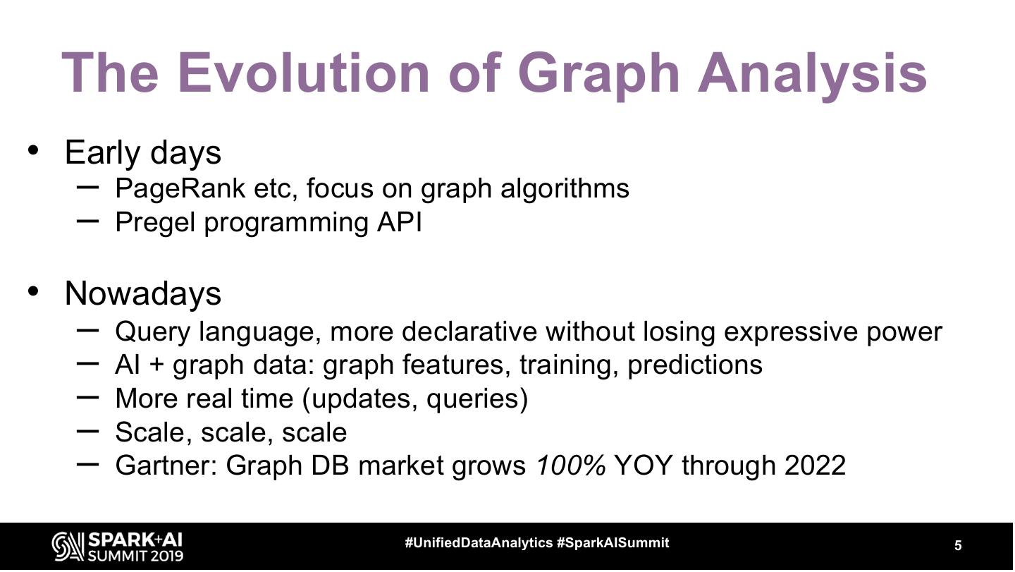 5 . The Evolution of Graph Analysis • Early days – PageRank etc, focus on graph algorithms – Pregel programming API • Nowadays – Query language, more declarative without losing expressive power – AI + graph data: graph features, training, predictions – More real time (updates, queries) – Scale, scale, scale – Gartner: Graph DB market grows 100% YOY through 2022 #UnifiedDataAnalytics #SparkAISummit 5
