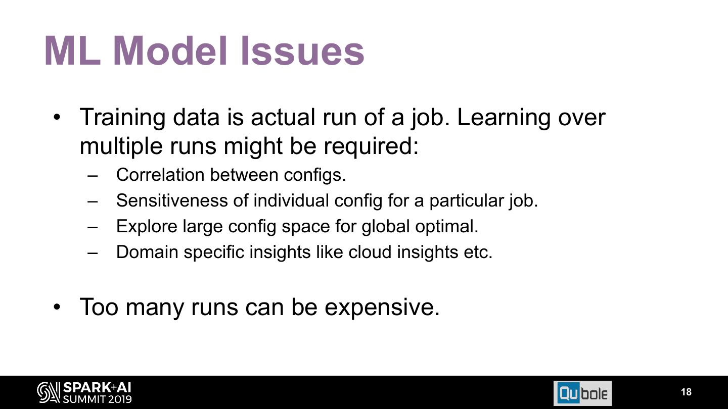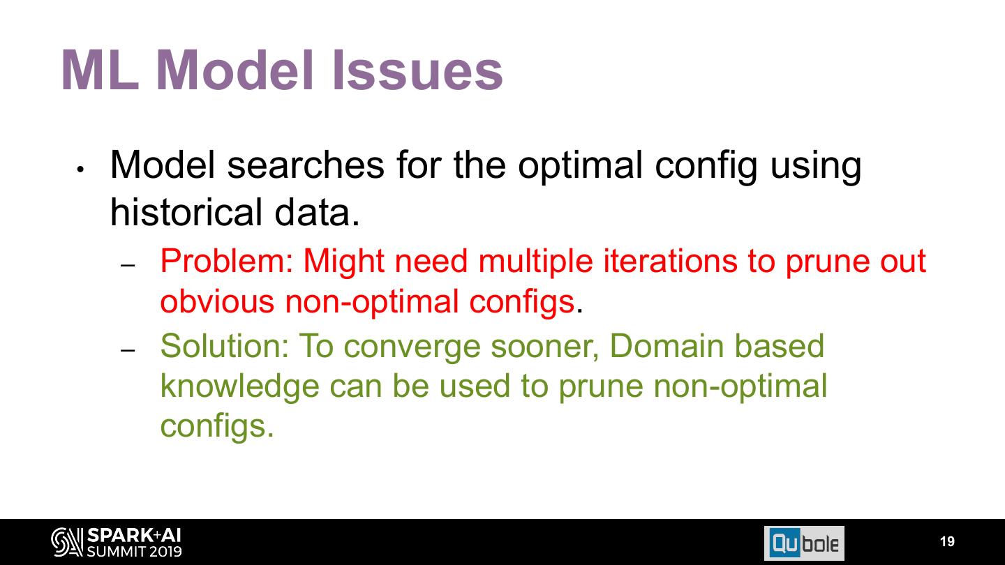 18 .ML Model Issues • Training data is actual run of a job. Learning over multiple runs might be required: – Correlation between configs. – Sensitiveness of individual config for a particular job. – Explore large config space for global optimal. – Domain specific insights like cloud insights etc. • Too many runs can be expensive. 18
