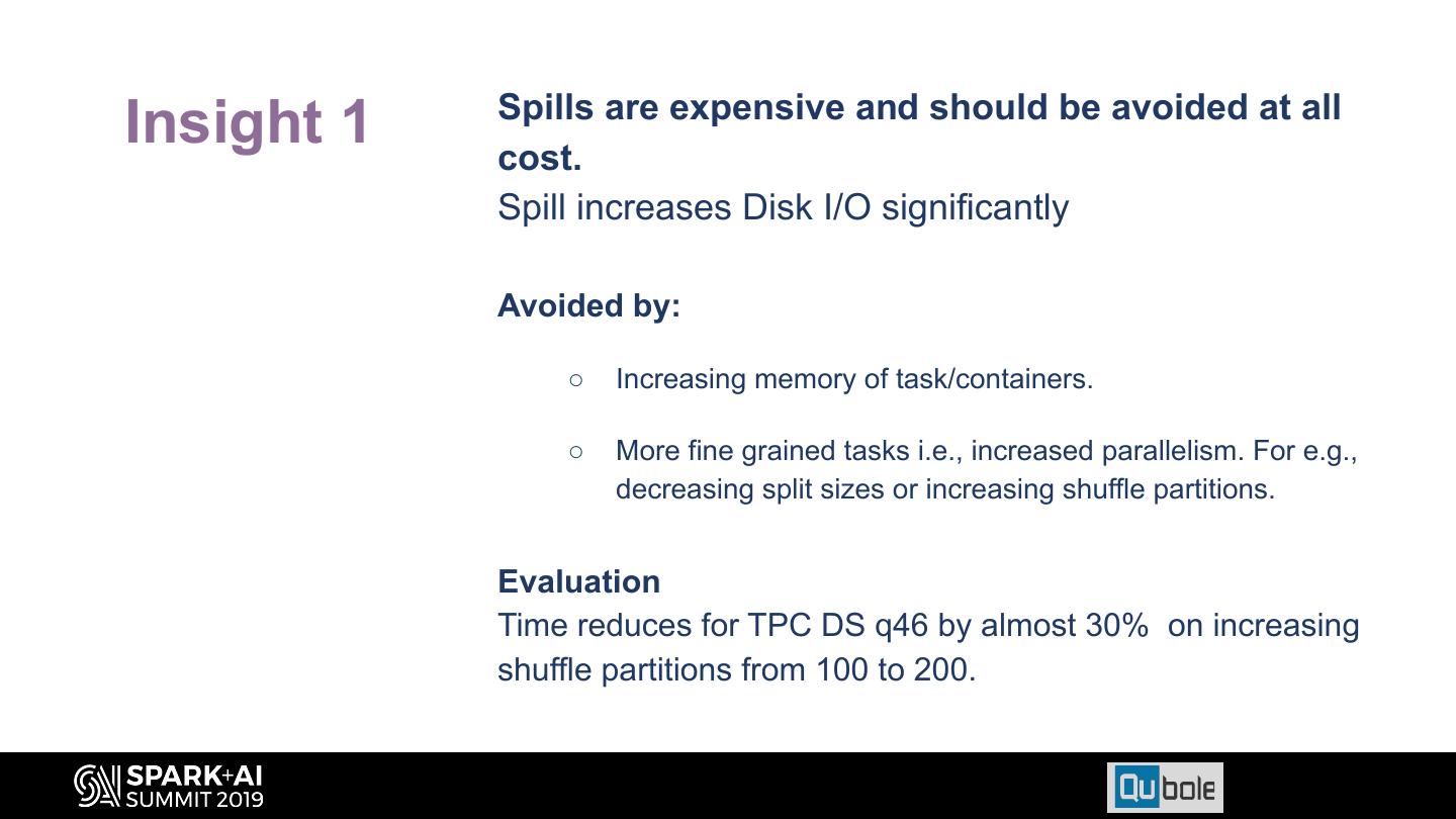 21 . Spills are expensive and should be avoided at all Insight 1 cost. Spill increases Disk I/O significantly Avoided by: ○ Increasing memory of task/containers. ○ More fine grained tasks i.e., increased parallelism. For e.g., decreasing split sizes or increasing shuffle partitions. Evaluation Time reduces for TPC DS q46 by almost 30% on increasing shuffle partitions from 100 to 200.