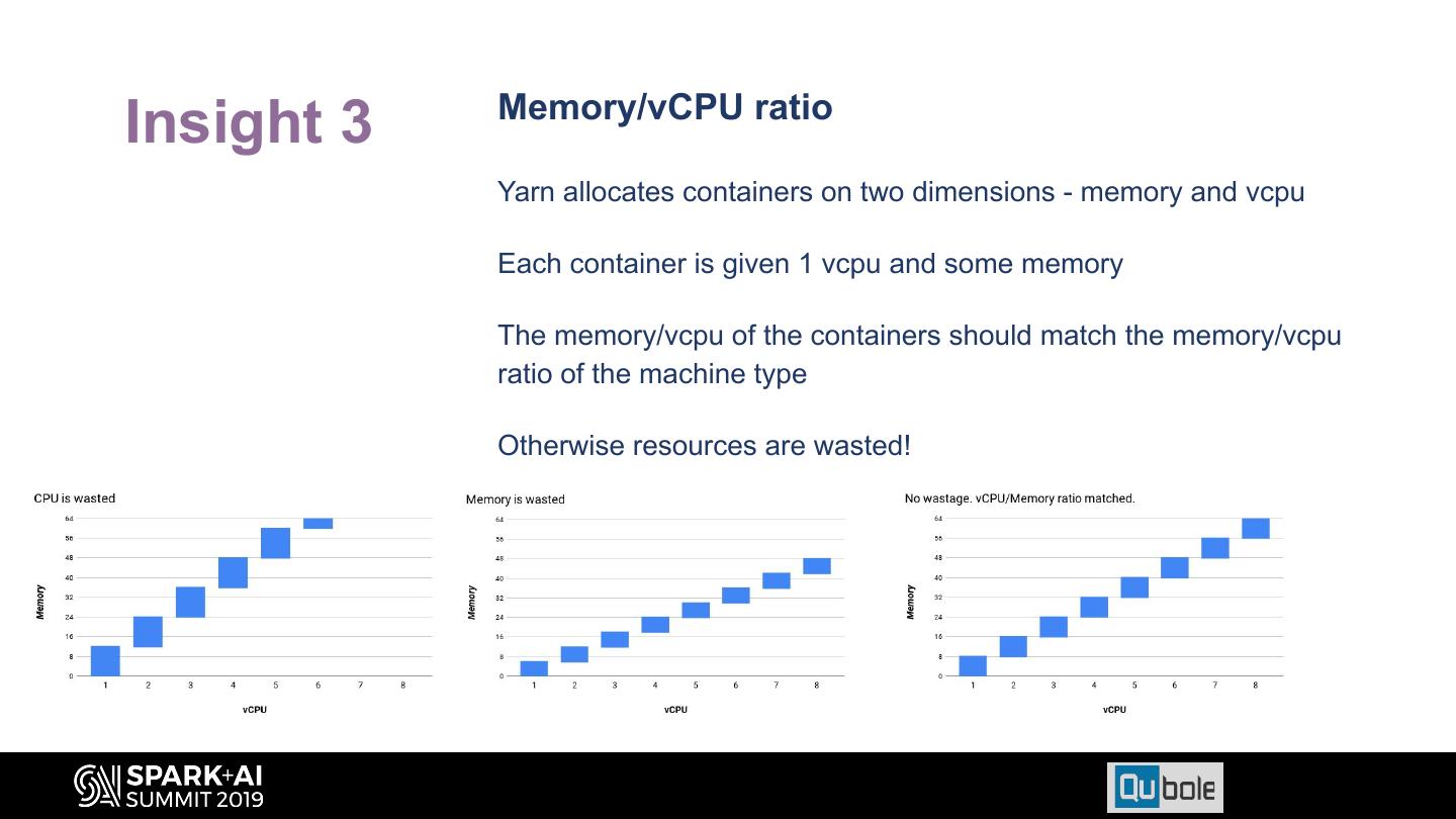 23 . Memory/vCPU ratio Insight 3 Yarn allocates containers on two dimensions - memory and vcpu Each container is given 1 vcpu and some memory The memory/vcpu of the containers should match the memory/vcpu ratio of the machine type Otherwise resources are wasted!