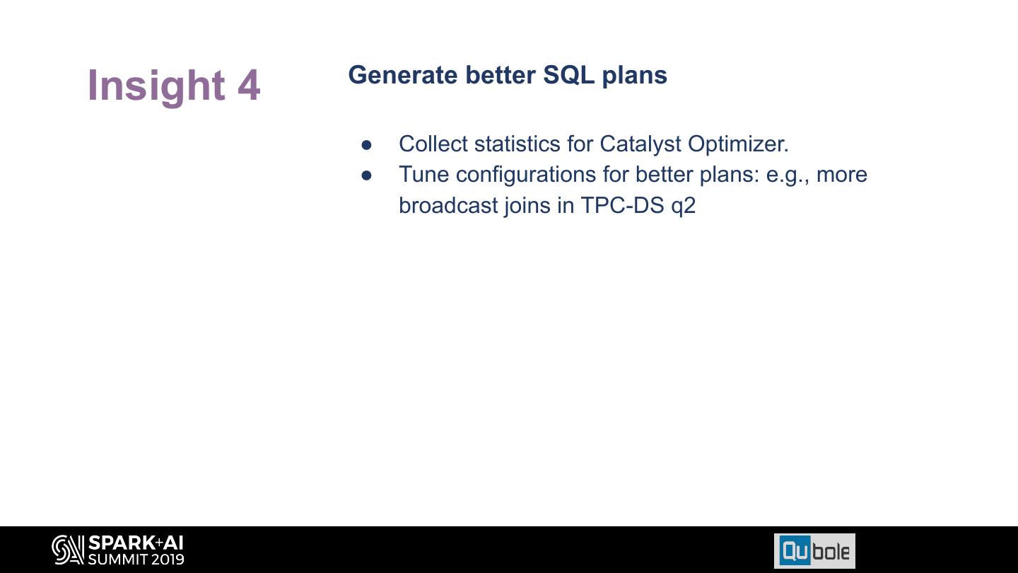 25 . Generate better SQL plans Insight 4 ● Collect statistics for Catalyst Optimizer. ● Tune configurations for better plans: e.g., more broadcast joins in TPC-DS q2