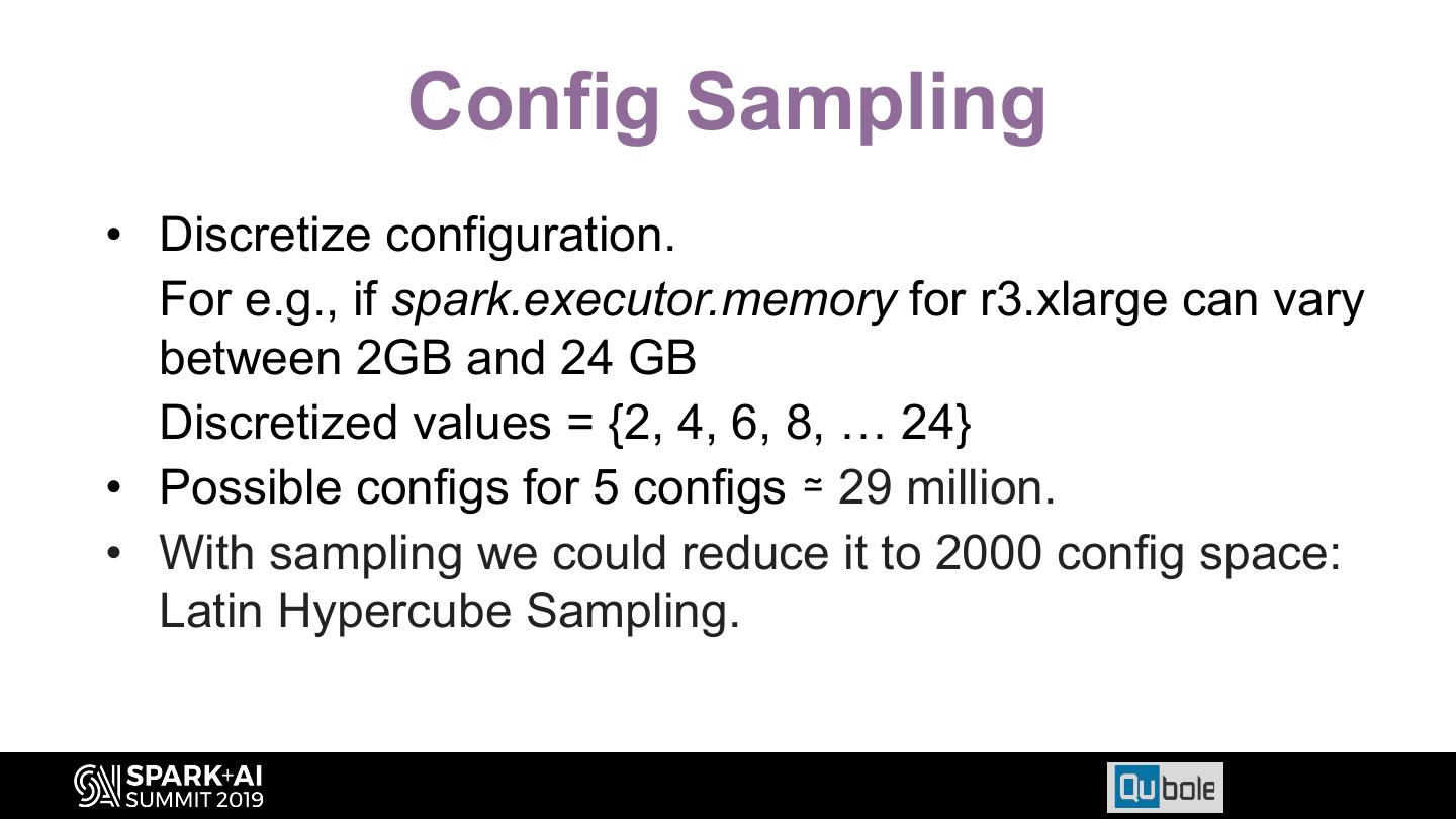 28 . Config Sampling • Discretize configuration. For e.g., if spark.executor.memory for r3.xlarge can vary between 2GB and 24 GB Discretized values = {2, 4, 6, 8, … 24} • Possible configs for 5 configs ≃ 29 million. • With sampling we could reduce it to 2000 config space: Latin Hypercube Sampling.