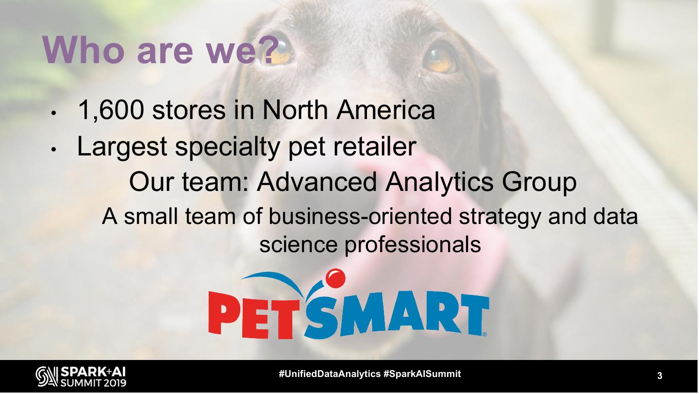 3 .Who are we? • 1,600 stores in North America • Largest specialty pet retailer Our team: Advanced Analytics Group A small team of business-oriented strategy and data science professionals #UnifiedDataAnalytics #SparkAISummit 3