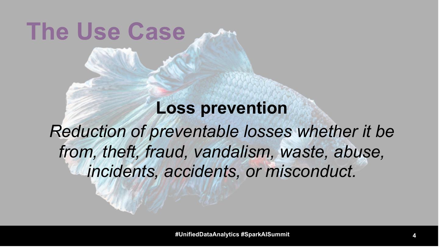 4 .The Use Case Loss prevention Reduction of preventable losses whether it be from, theft, fraud, vandalism, waste, abuse, incidents, accidents, or misconduct. #UnifiedDataAnalytics #SparkAISummit 4