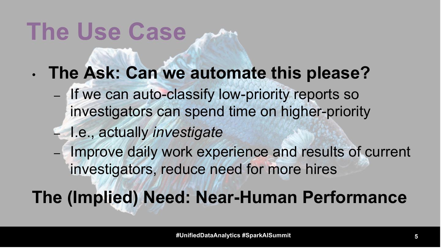 5 .The Use Case • The Ask: Can we automate this please? – If we can auto-classify low-priority reports so investigators can spend time on higher-priority – I.e., actually investigate – Improve daily work experience and results of current investigators, reduce need for more hires The (Implied) Need: Near-Human Performance #UnifiedDataAnalytics #SparkAISummit 5