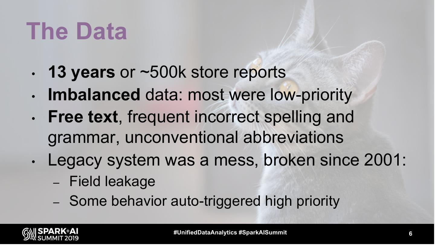 6 .The Data • 13 years or ~500k store reports • Imbalanced data: most were low-priority • Free text, frequent incorrect spelling and grammar, unconventional abbreviations • Legacy system was a mess, broken since 2001: – Field leakage – Some behavior auto-triggered high priority #UnifiedDataAnalytics #SparkAISummit 6