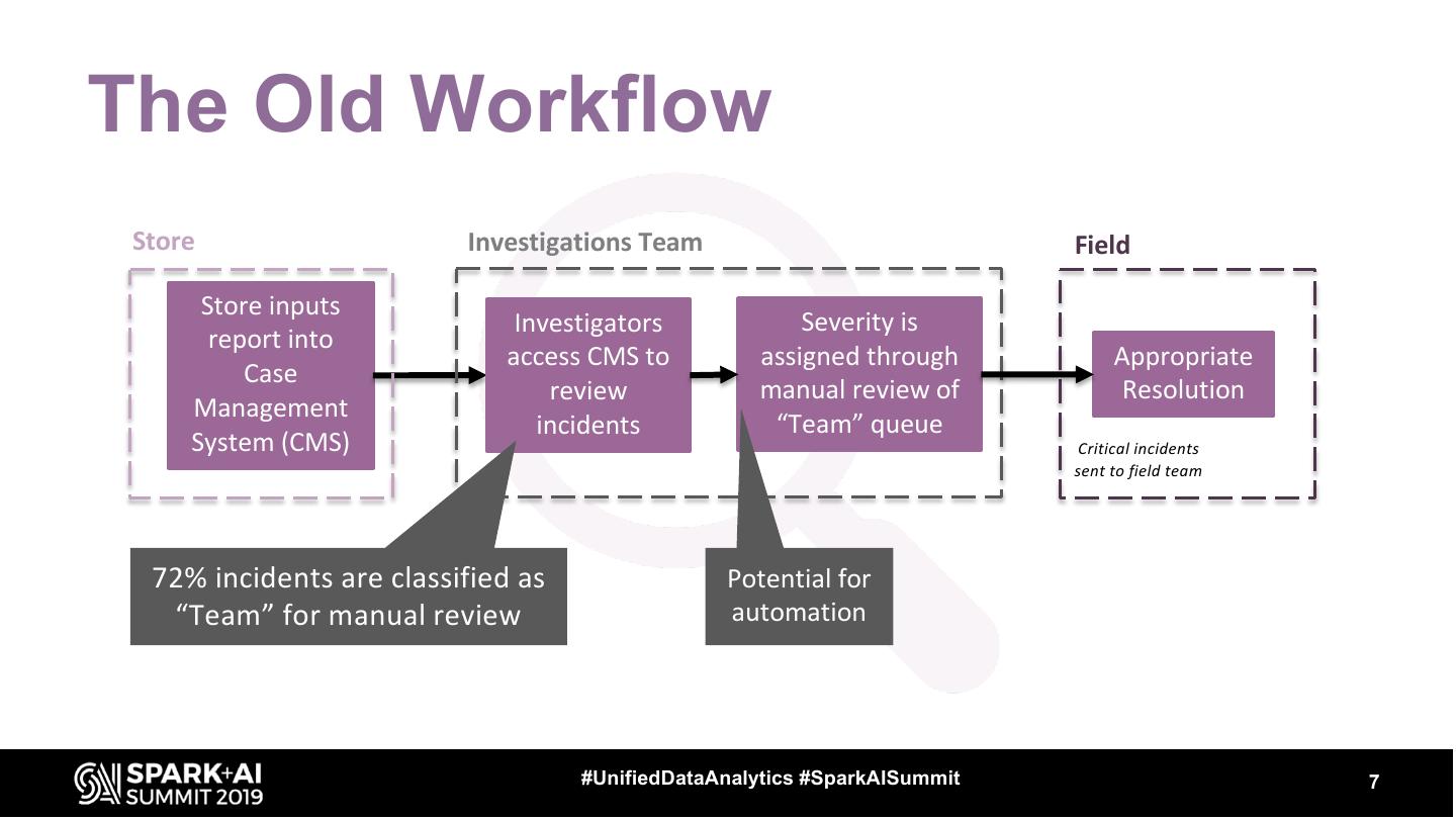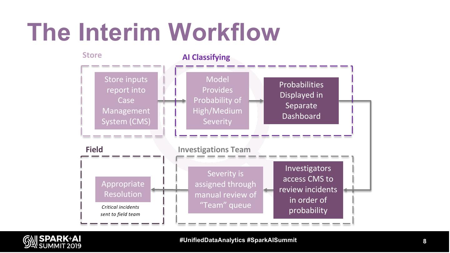 7 .The Old Workflow Store Investigations Team Field Store inputs Investigators Severity is report into access CMS to assigned through Appropriate Case review manual review of Resolution Management incidents “Team” queue System (CMS) Critical incidents sent to field team 72% incidents are classified as Potential for “Team” for manual review automation #UnifiedDataAnalytics #SparkAISummit 7