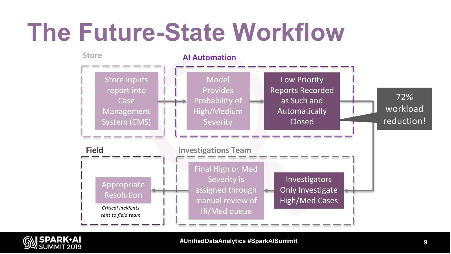 8 .The Interim Workflow Store AI Classifying Store inputs Model Probabilities report into Provides Displayed in Case Probability of Separate Management High/Medium Dashboard System (CMS) Severity Field Investigations Team Investigators Severity is access CMS to Appropriate assigned through review incidents Resolution manual review of in order of Critical incidents “Team” queue sent to field team probability #UnifiedDataAnalytics #SparkAISummit 8