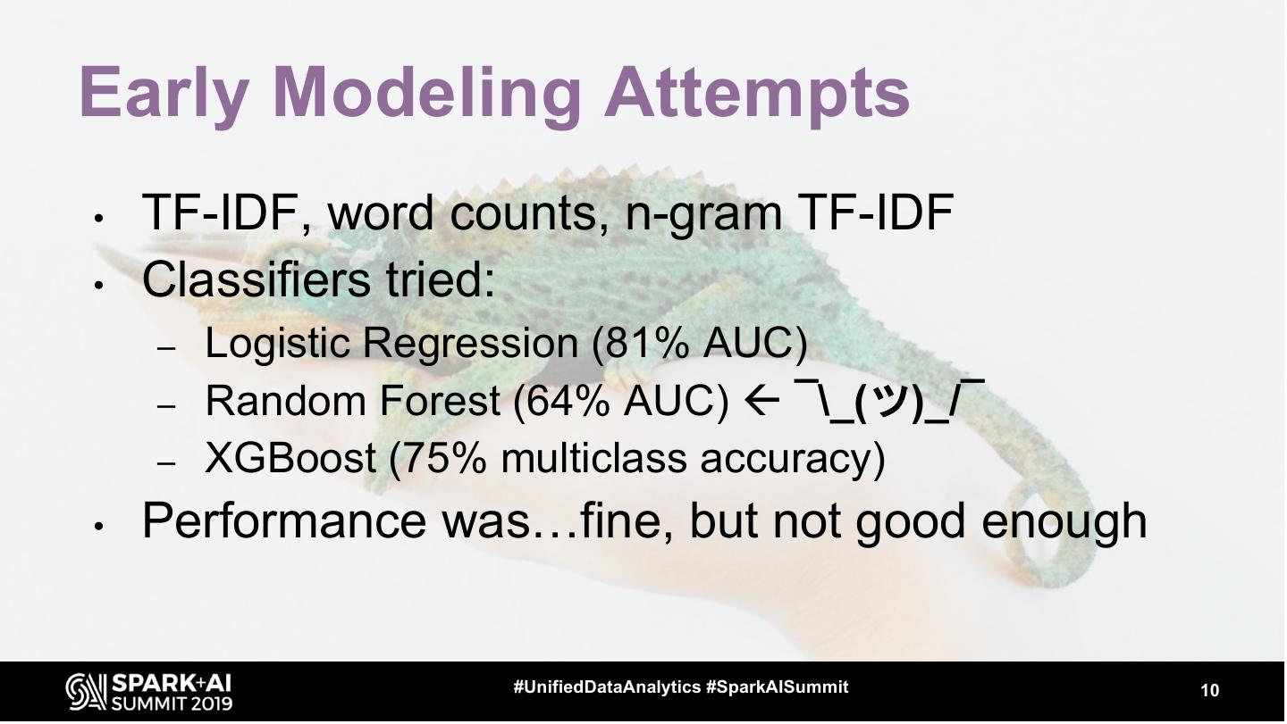 10 .Early Modeling Attempts • TF-IDF, word counts, n-gram TF-IDF • Classifiers tried: – Logistic Regression (81% AUC) – Random Forest (64% AUC) ß ¯\_(ツ)_/¯ – XGBoost (75% multiclass accuracy) • Performance was…fine, but not good enough #UnifiedDataAnalytics #SparkAISummit 10