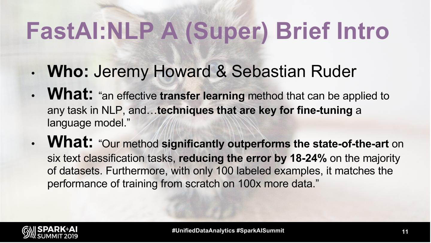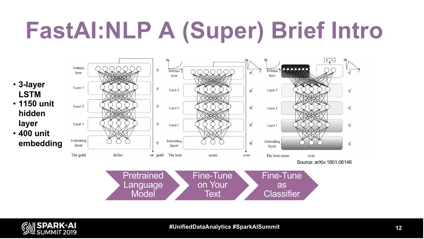 11 .FastAI:NLP A (Super) Brief Intro • Who: Jeremy Howard & Sebastian Ruder • What: “an effective transfer learning method that can be applied to any task in NLP, and…techniques that are key for fine-tuning a language model.” • What: “Our method significantly outperforms the state-of-the-art on six text classification tasks, reducing the error by 18-24% on the majority of datasets. Furthermore, with only 100 labeled examples, it matches the performance of training from scratch on 100x more data.” #UnifiedDataAnalytics #SparkAISummit 11