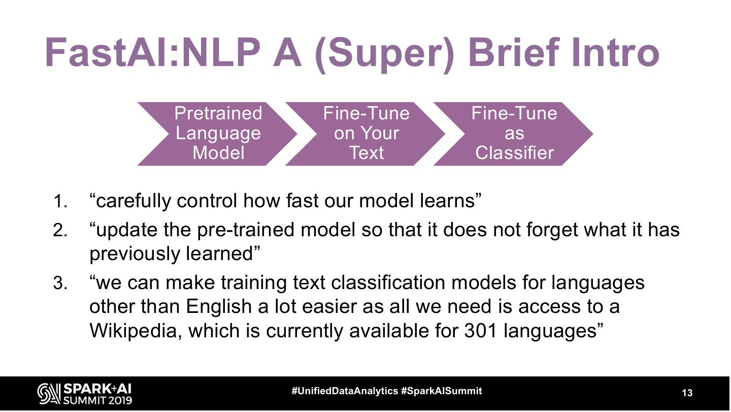 13 .FastAI:NLP A (Super) Brief Intro Pretrained Fine-Tune Fine-Tune Language on Your as Model Text Classifier 1. “carefully control how fast our model learns” 2. “update the pre-trained model so that it does not forget what it has previously learned” 3. “we can make training text classification models for languages other than English a lot easier as all we need is access to a Wikipedia, which is currently available for 301 languages” #UnifiedDataAnalytics #SparkAISummit 13