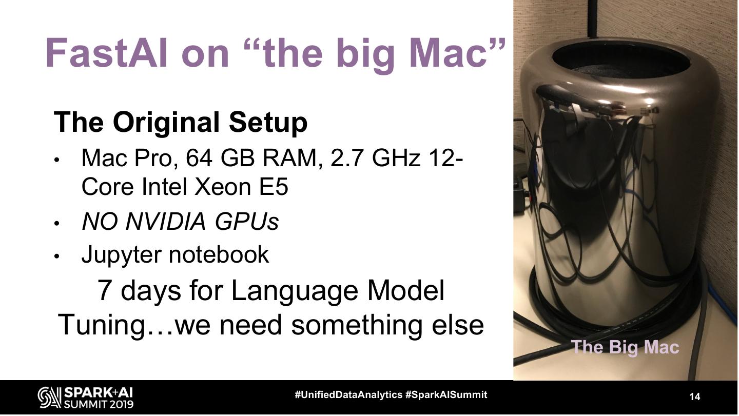 14 .FastAI on “the big Mac” The Original Setup • Mac Pro, 64 GB RAM, 2.7 GHz 12- Core Intel Xeon E5 • NO NVIDIA GPUs • Jupyter notebook 7 days for Language Model Tuning…we need something else The Big Mac #UnifiedDataAnalytics #SparkAISummit 14