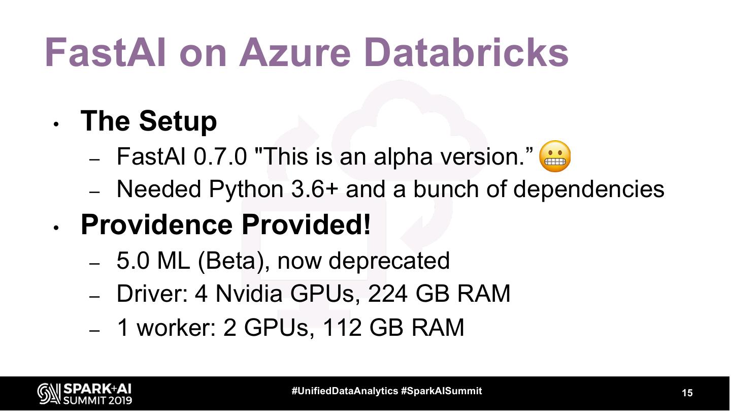15 .FastAI on Azure Databricks • The Setup – FastAI 0.7.0 "This is an alpha version.” – Needed Python 3.6+ and a bunch of dependencies • Providence Provided! – 5.0 ML (Beta), now deprecated – Driver: 4 Nvidia GPUs, 224 GB RAM – 1 worker: 2 GPUs, 112 GB RAM #UnifiedDataAnalytics #SparkAISummit 15