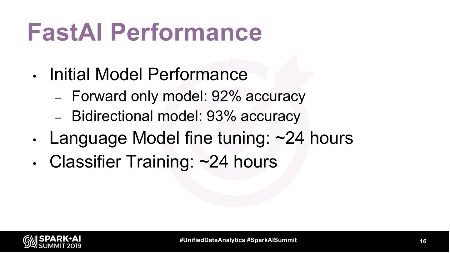 16 .FastAI Performance • Initial Model Performance – Forward only model: 92% accuracy – Bidirectional model: 93% accuracy • Language Model fine tuning: ~24 hours • Classifier Training: ~24 hours #UnifiedDataAnalytics #SparkAISummit 16