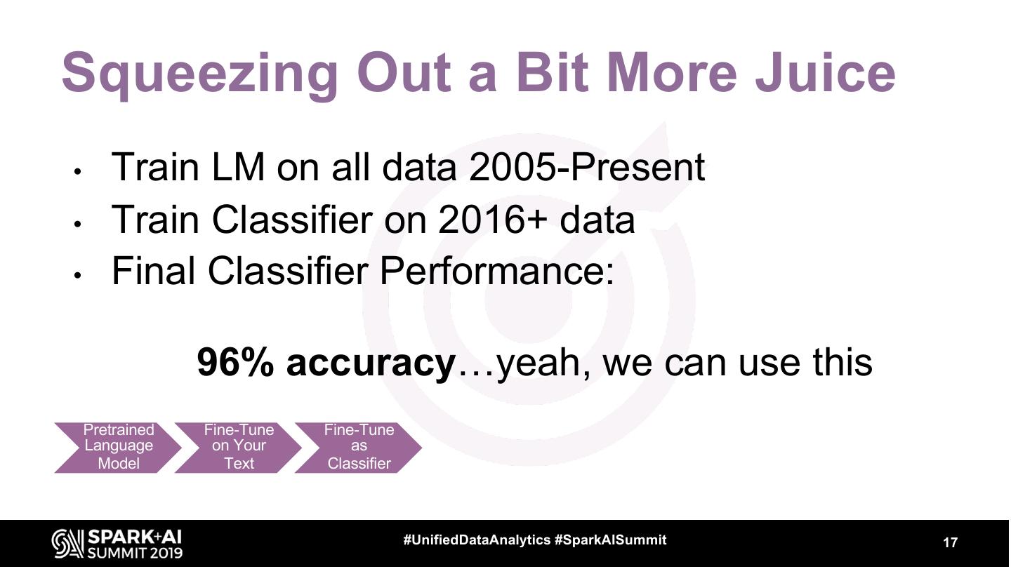 17 .Squeezing Out a Bit More Juice • Train LM on all data 2005-Present • Train Classifier on 2016+ data • Final Classifier Performance: 96% accuracy…yeah, we can use this Pretrained Fine-Tune Fine-Tune Language on Your as Model Text Classifier #UnifiedDataAnalytics #SparkAISummit 17