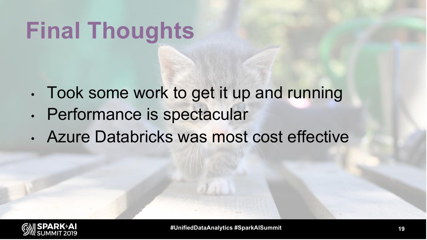 19 .Final Thoughts • Took some work to get it up and running • Performance is spectacular • Azure Databricks was most cost effective #UnifiedDataAnalytics #SparkAISummit 19