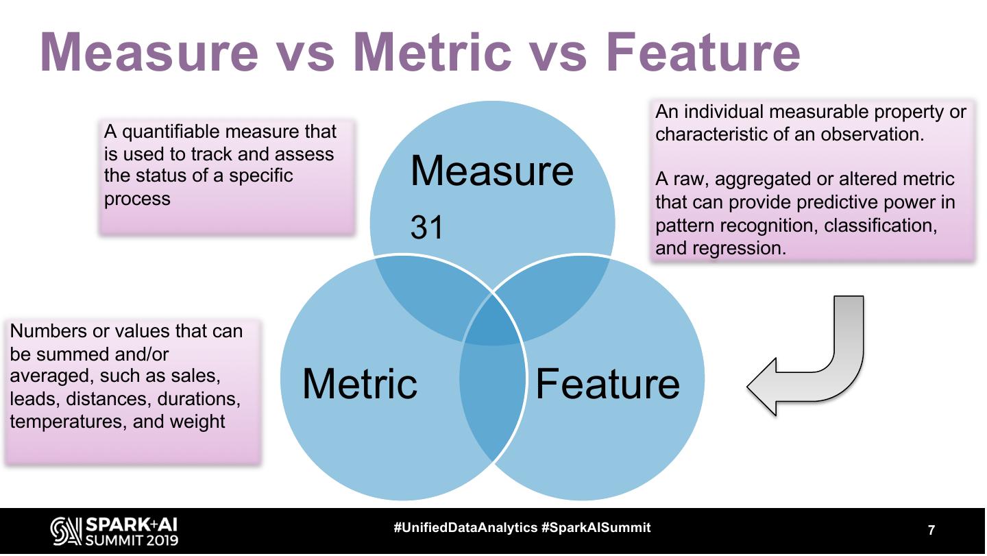 6 . Measure vs Metric vs Feature An individual measurable property or A quantifiable measure that characteristic of an observation. is used to track and assess the status of a specific A raw, aggregated or altered metric process Measure that can provide predictive power in pattern recognition, classification, and regression. Numbers or values that can be summed and/or averaged, such as sales, leads, distances, durations, Metric Feature temperatures, and weight #UnifiedDataAnalytics #SparkAISummit 6