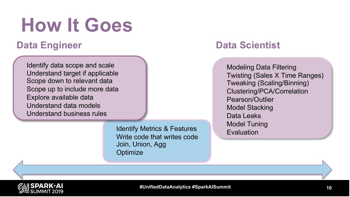 10 .How It Goes Data Engineer Data Scientist Identify data scope and scale Modeling Data Filtering Understand target if applicable Twisting (Sales X Time Ranges) Scope down to relevant data Tweaking (Scaling/Binning) Scope up to include more data Clustering/PCA/Correlation Explore available data Pearson/Outlier Understand data models Model Stacking Understand business rules Data Leaks Model Tuning Identify Metrics & Features Evaluation Write code that writes code Join, Union, Agg Optimize #UnifiedDataAnalytics #SparkAISummit 10