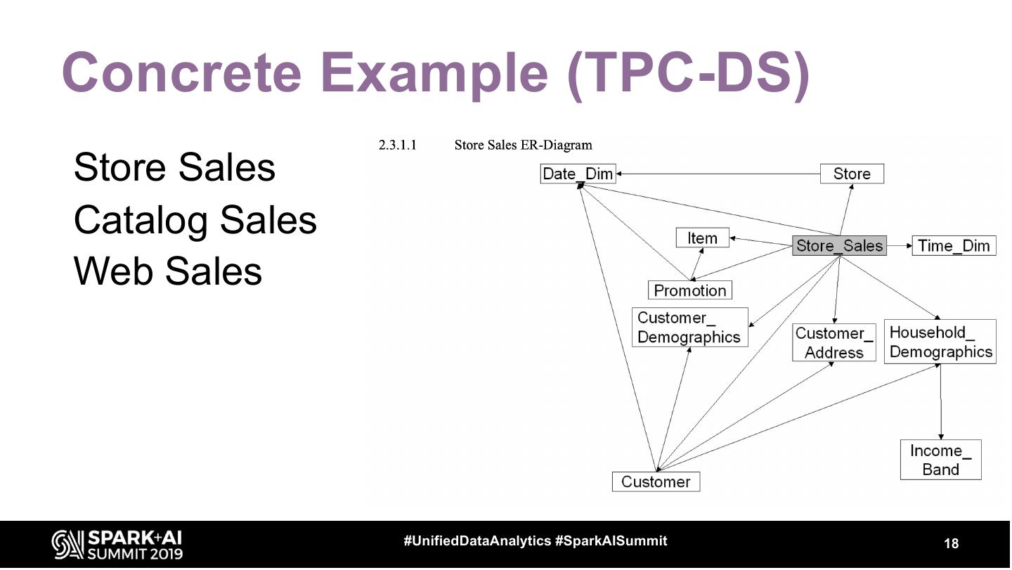 18 .Concrete Example (TPC-DS) Store Sales Catalog Sales Web Sales #UnifiedDataAnalytics #SparkAISummit 18