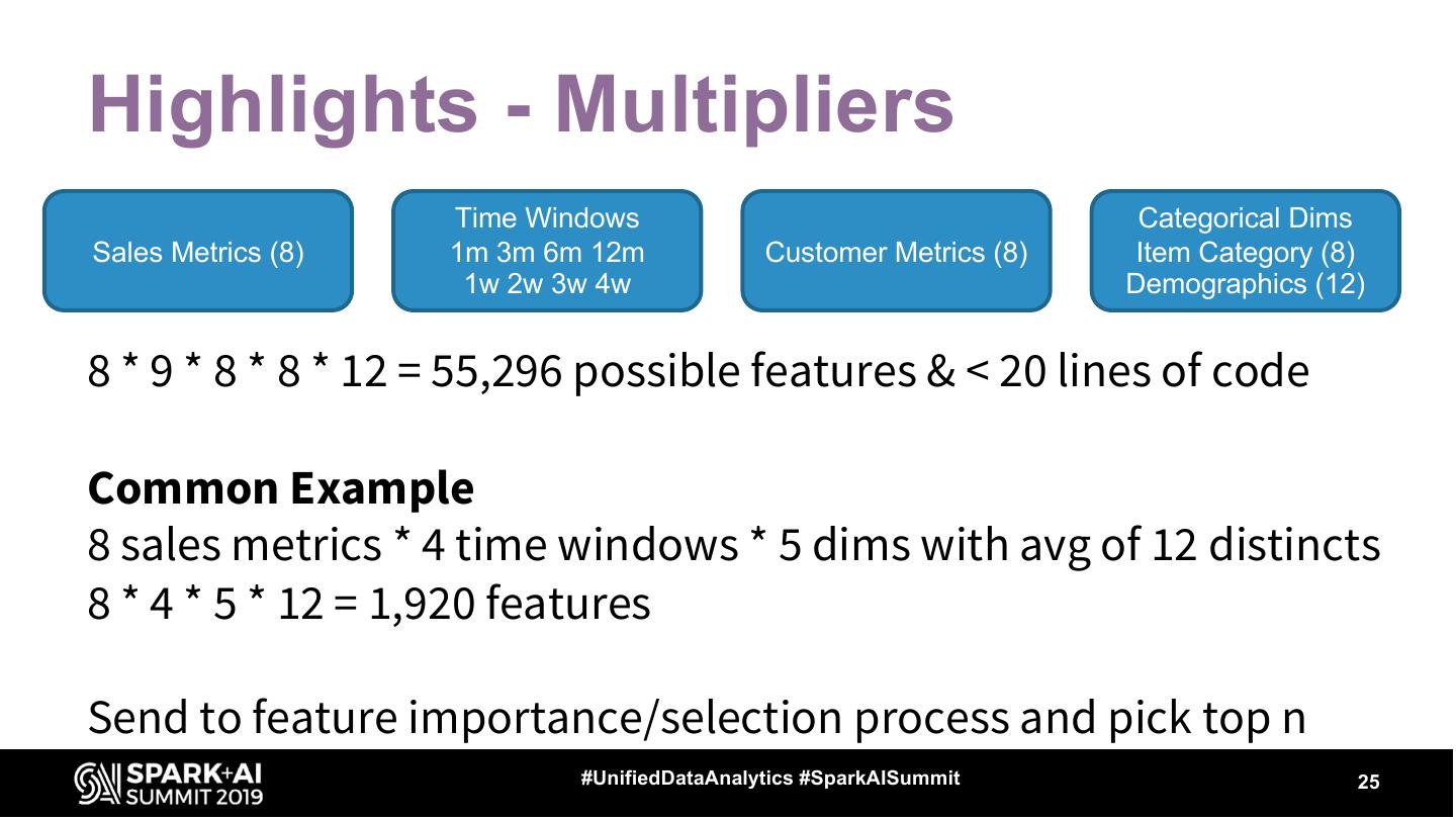 24 . Highlights - Multipliers Feature Families Multipliers – Sales – Time – Customer – Categorical – Weather – Trends – Geo Time Window (Multiplier) Base Metrics Base Metric Categorical (Sales/Customer) (Weather/Geo) (Category) Total_Sales_6m_Sunny_Category-MensShoes Total_Customers_3m_GeoRange_CheckoutMethod-Self #UnifiedDataAnalytics #SparkAISummit 24