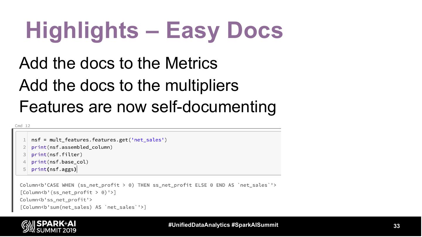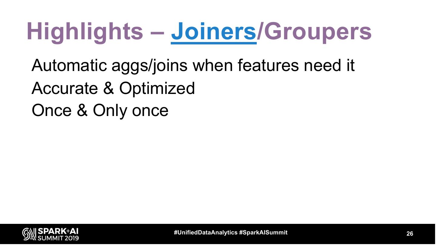 26 .Highlights – Joiners/Groupers Automatic aggs/joins when features need it Accurate & Optimized Once & Only once #UnifiedDataAnalytics #SparkAISummit 26