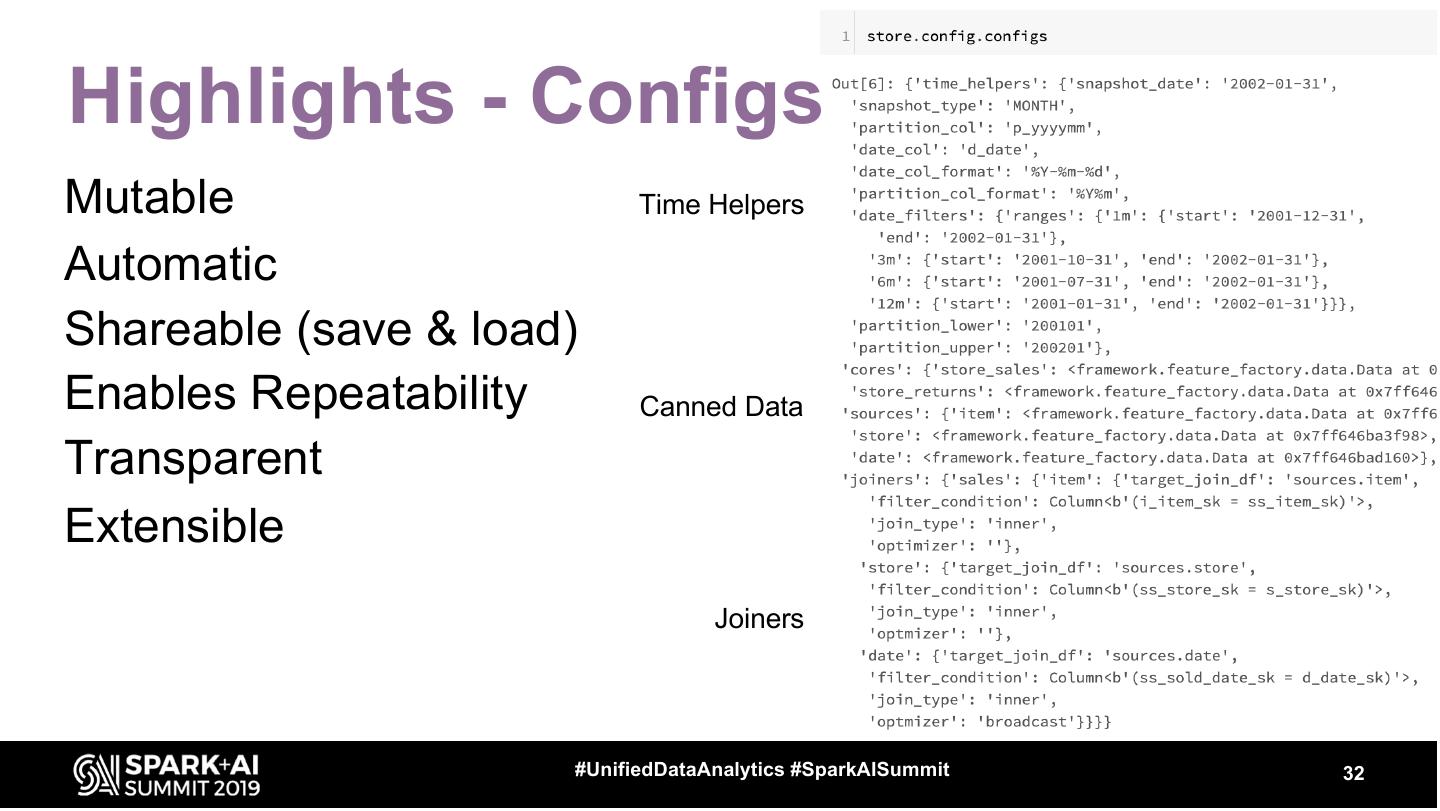 25 .Highlights - Multipliers Time Windows Categorical Dims Sales Metrics (8) 1m 3m 6m 12m Customer Metrics (8) Item Category (8) 1w 2w 3w 4w Demographics (12) 8 * 9 * 8 * 8 * 12 = 55,296 possible features & < 20 lines of code Common Example 8 sales metrics * 4 time windows * 5 dims with avg of 12 distincts 8 * 4 * 5 * 12 = 1,920 features Send to feature importance/selection process and pick top n #UnifiedDataAnalytics #SparkAISummit 25