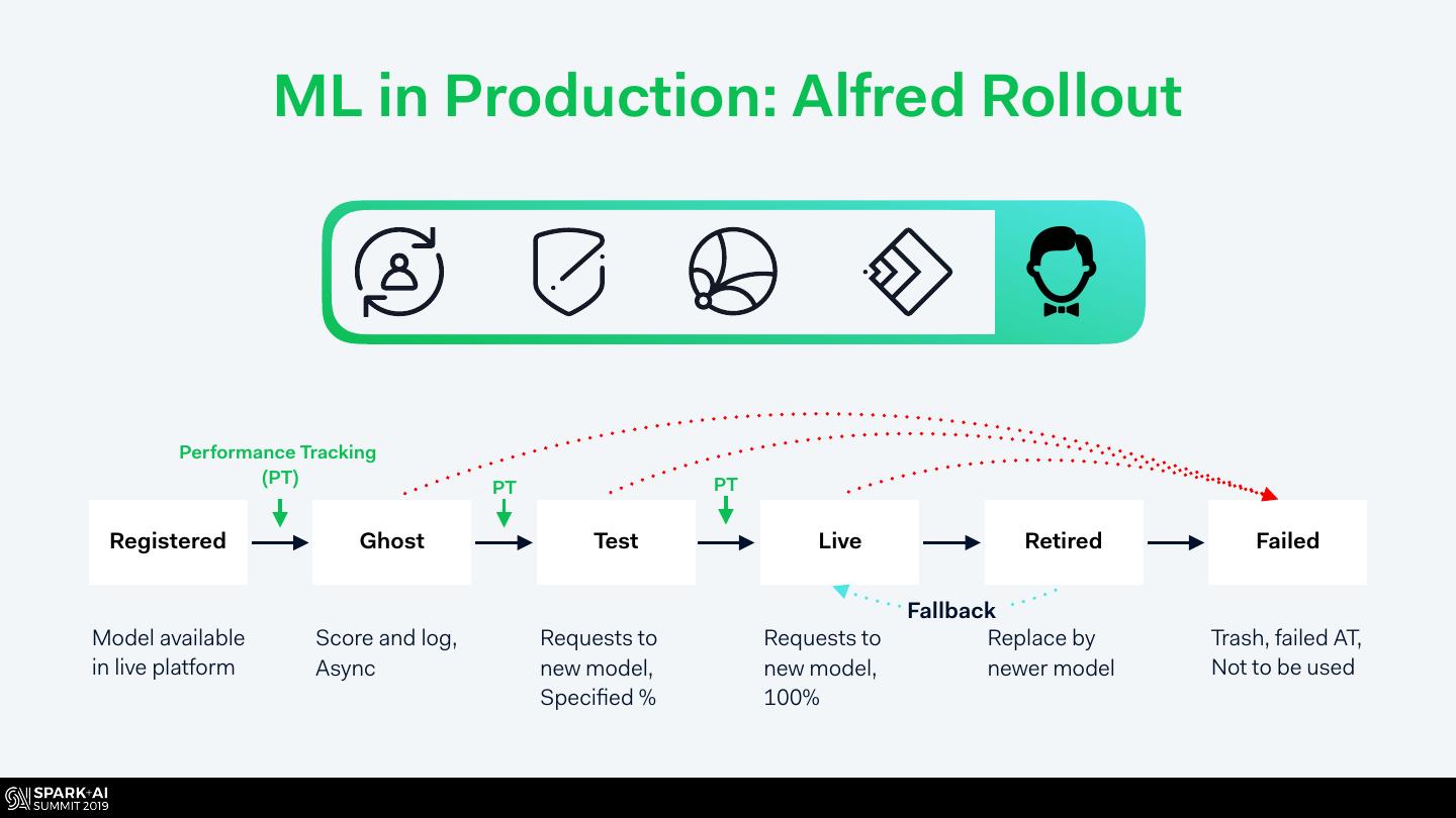 22 . ML in Production: Alfred Rollout Performance Tracking (PT) PT PT Registered Ghost Test Live Retired Failed Fallback Model available Score and log, Requests to Requests to Replace by Trash, failed AT, in live platform Async new model, new model, newer model Not to be used Specified % 100%