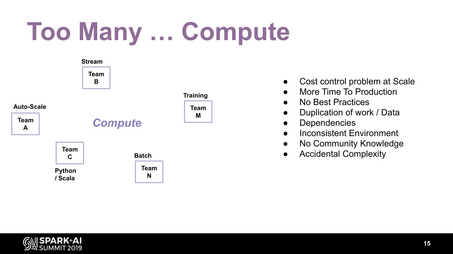 14 .Too Many … Compute Stream Team B Training Auto-Scale Team M Team A Compute Team Batch C Python Team / Scala N Data Sources 14