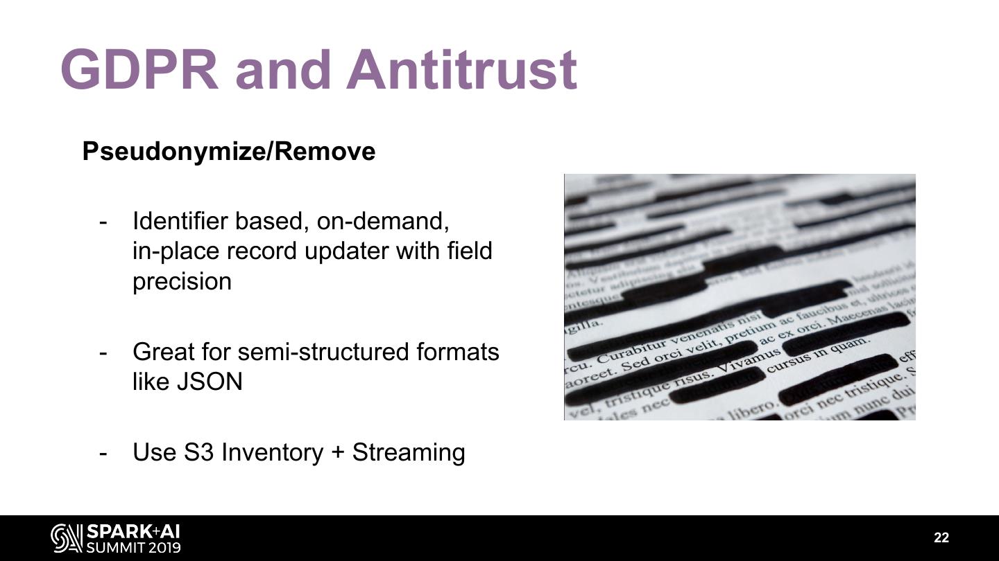 22 .GDPR and Antitrust Pseudonymize/Remove - Identifier based, on-demand, in-place record updater with field precision - Great for semi-structured formats like JSON - Use S3 Inventory + Streaming 22