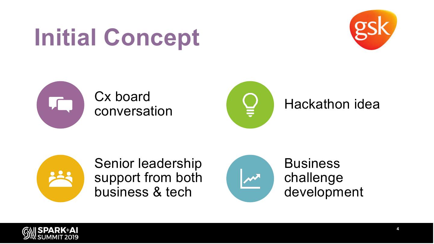 3 .Introduction • GSK are a science-led global healthcare company. Our purpose is to help people do more, feel better, live longer • 3 global businesses – Pharmaceutical medicines, vaccines and consumer healthcare products. • Our goal is to be one of the world’s most innovative, best performing and trusted healthcare companies #UnifiedDataAnalytics #SparkAISummit 3