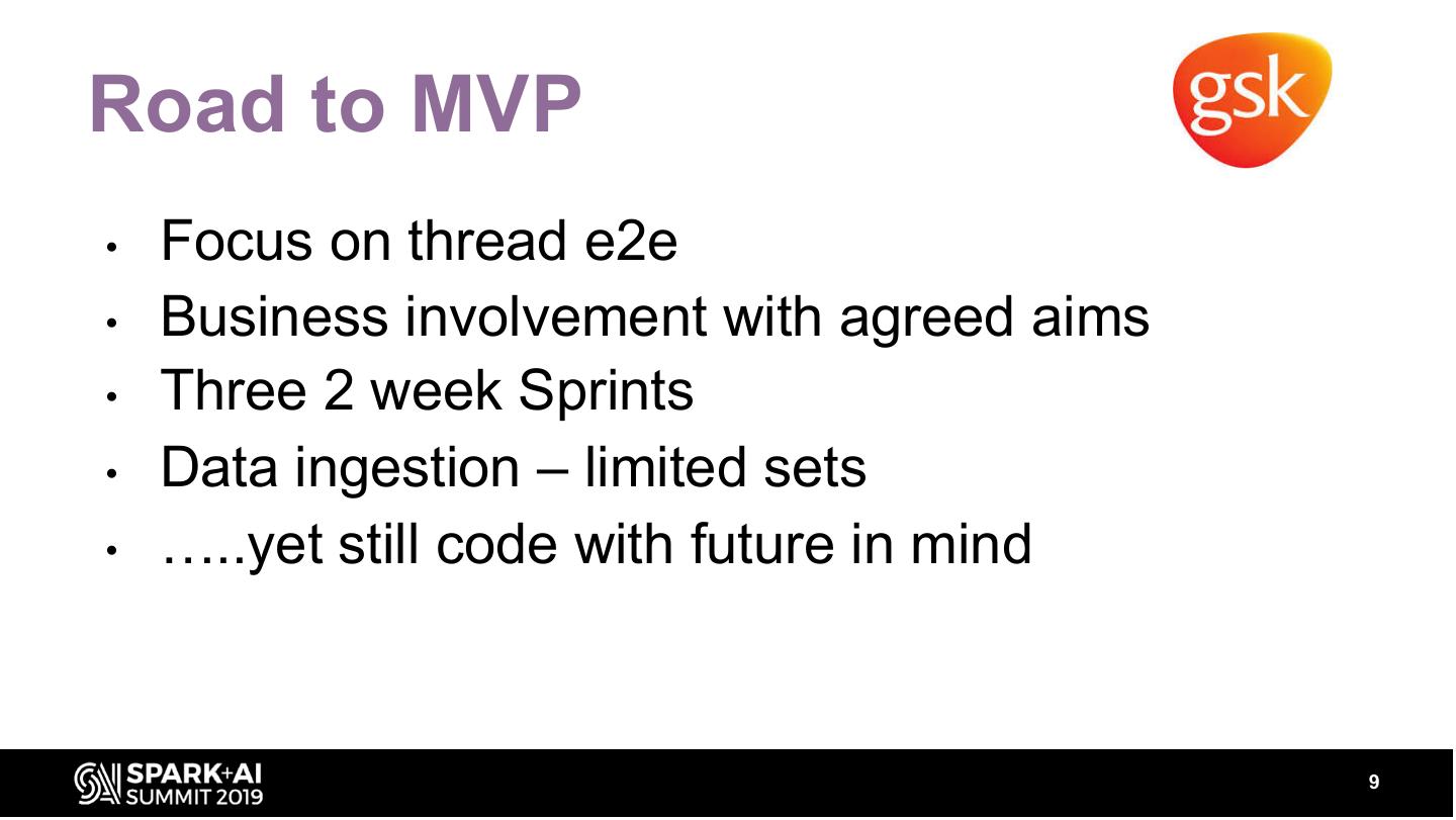 9 .Road to MVP • Focus on thread e2e • Business involvement with agreed aims • Three 2 week Sprints • Data ingestion – limited sets • …..yet still code with future in mind 9