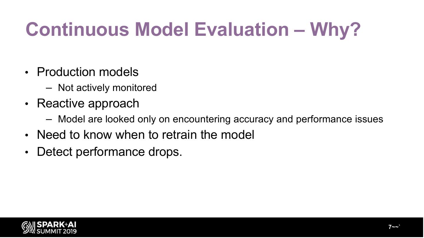7 .Continuous Model Evaluation – Why? • Production models – Not actively monitored • Reactive approach – Model are looked only on encountering accuracy and performance issues • Need to know when to retrain the model • Detect performance drops. 7~~`