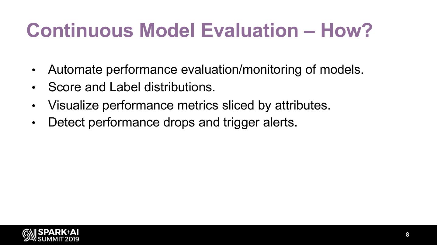 These metrics can be sliced by input features (e.g. Geography, Product type) to provide insights into model performance over different segments. The talk will describe various components that are required in building such a service and metrics of interest. Our system has a backend component built with spark on Azure Databricks. The backend can scale to analyze TBs of data to generate model evaluation metrics.