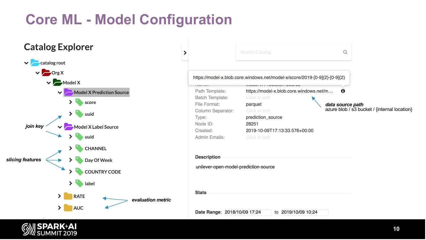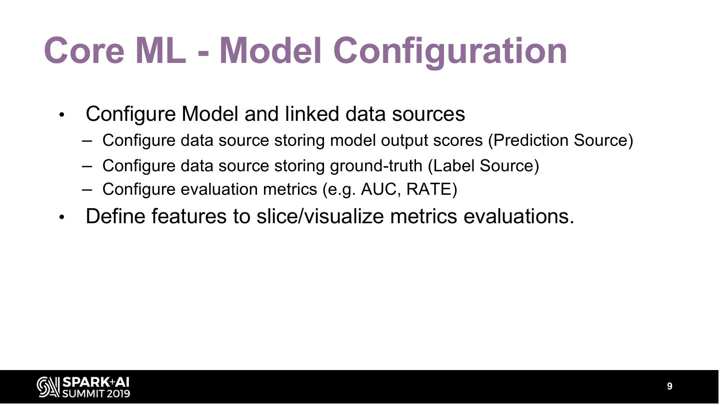 9 .Core ML - Model Configuration • Configure Model and linked data sources – Configure data source storing model output scores (Prediction Source) – Configure data source storing ground-truth (Label Source) – Configure evaluation metrics (e.g. AUC, RATE) • Define features to slice/visualize metrics evaluations. 9