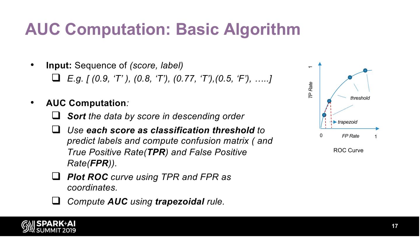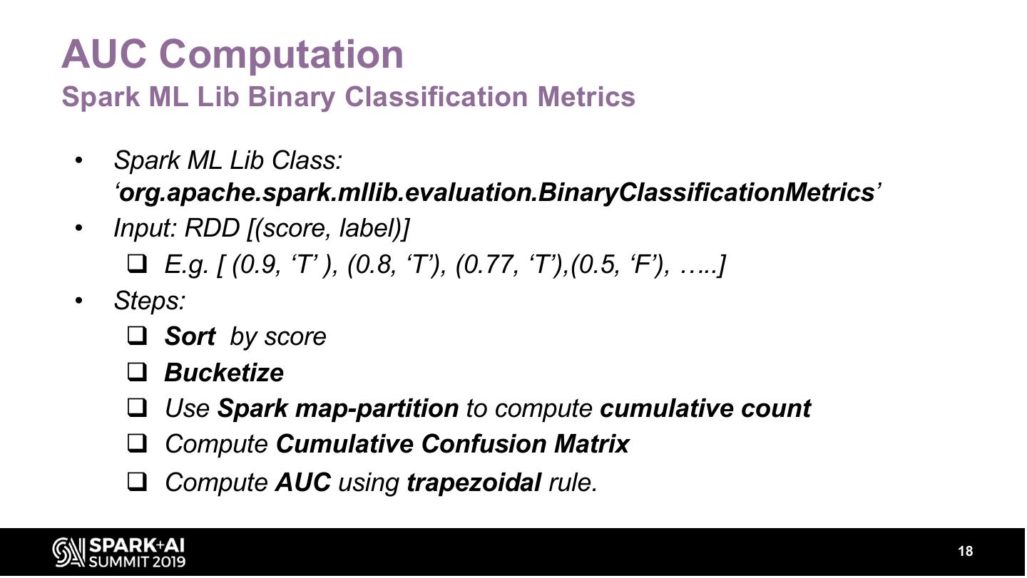 18 .AUC Computation Spark ML Lib Binary Classification Metrics • Spark ML Lib Class: ‘org.apache.spark.mllib.evaluation.BinaryClassificationMetrics’ • Input: RDD [(score, label)] q E.g. [ (0.9, ‘T’ ), (0.8, ‘T’), (0.77, ‘T’),(0.5, ‘F’), …..] • Steps: q Sort by score q Bucketize q Use Spark map-partition to compute cumulative count q Compute Cumulative Confusion Matrix q Compute AUC using trapezoidal rule. 18