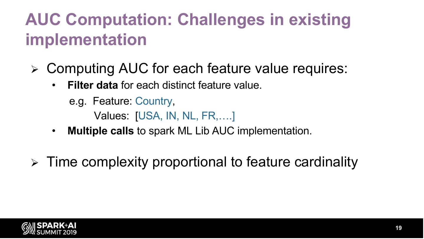 19 .AUC Computation: Challenges in existing implementation Ø Computing AUC for each feature value requires: • Filter data for each distinct feature value. e.g. Feature: Country, Values: [USA, IN, NL, FR,….] • Multiple calls to spark ML Lib AUC implementation. Ø Time complexity proportional to feature cardinality 19