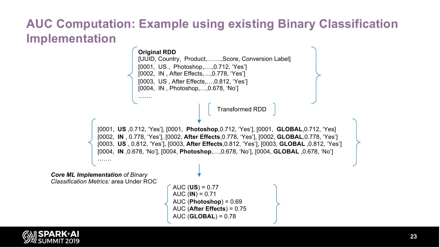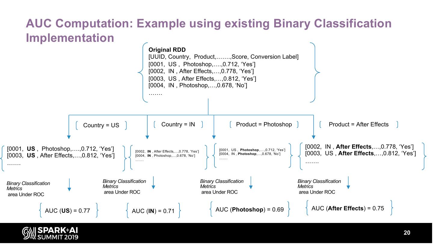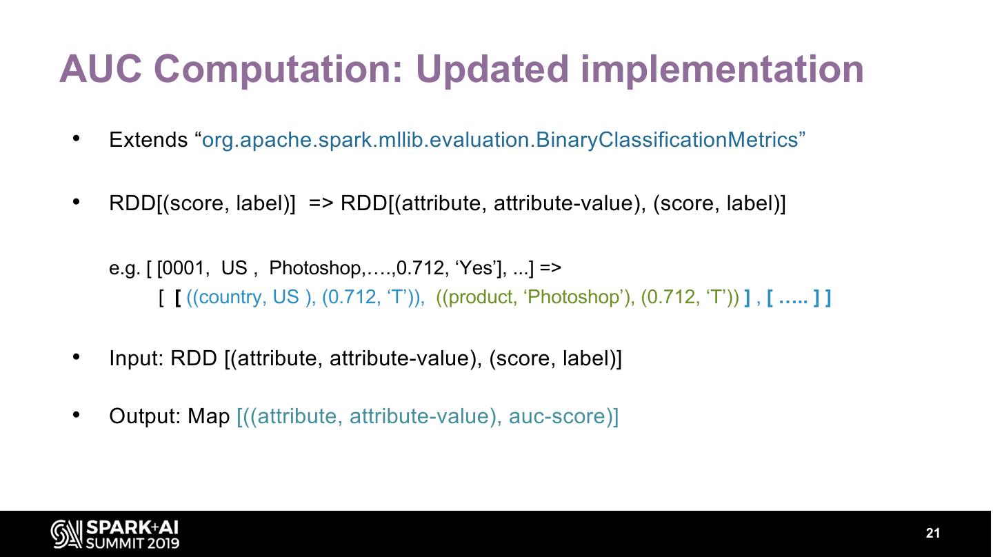 20 . AUC Computation: Example using existing Binary Classification Implementation Original RDD [UUID, Country, Product,…….,Score, Conversion Label] [0001, US , Photoshop,….,0.712, ‘Yes’] [0002, IN , After Effects,…,0.778, ‘Yes’] [0003, US , After Effects,…,0.812, ‘Yes’] [0004, IN , Photoshop,…,0.678, ‘No’] ……. Country = US Country = IN Product = Photoshop Product = After Effects [0001, US , Photoshop,….,0.712, ‘Yes’] [0001, US , Photoshop,….,0.712, ‘Yes’] [0002, IN , After Effects,…,0.778, ‘Yes’] [0002, IN , After Effects,…,0.778, ‘Yes’] [0003, US , After Effects,…,0.812, ‘Yes’] [0004, IN , Photoshop,…,0.678, ‘No’] [0004, IN , Photoshop,…,0.678, ‘No’] [0003, US , After Effects,…,0.812, ‘Yes’] ……. ……. ……. ……. Binary Classification Binary Classification Binary Classification Binary Classification Metrics Metrics Metrics Metrics area Under ROC area Under ROC area Under ROC area Under ROC AUC (US) = 0.77 AUC (IN) = 0.71 AUC (Photoshop) = 0.69 AUC (After Effects) = 0.75 20