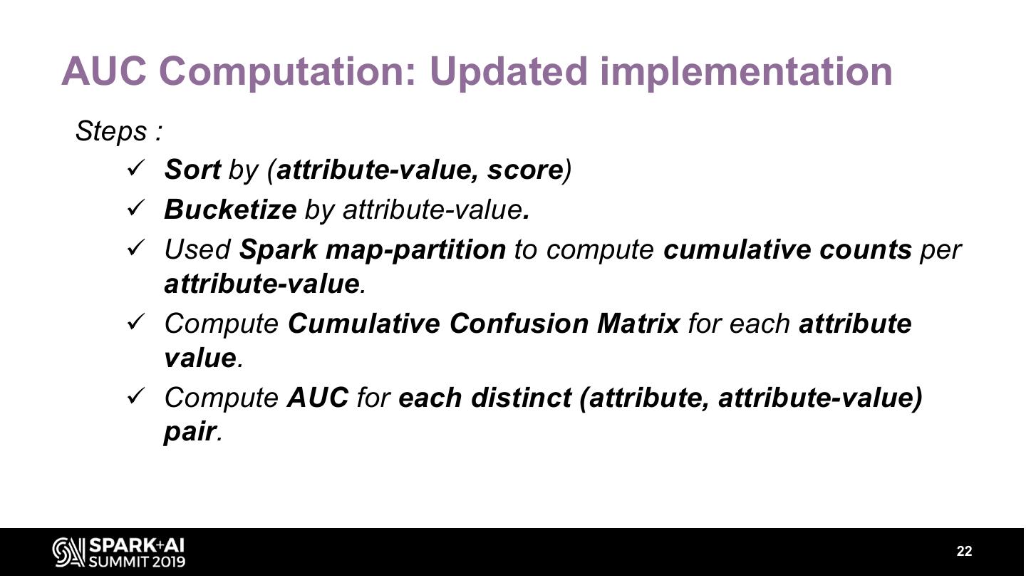 22 .AUC Computation: Updated implementation Steps : ü Sort by (attribute-value, score) ü Bucketize by attribute-value. ü Used Spark map-partition to compute cumulative counts per attribute-value. ü Compute Cumulative Confusion Matrix for each attribute value. ü Compute AUC for each distinct (attribute, attribute-value) pair. 22