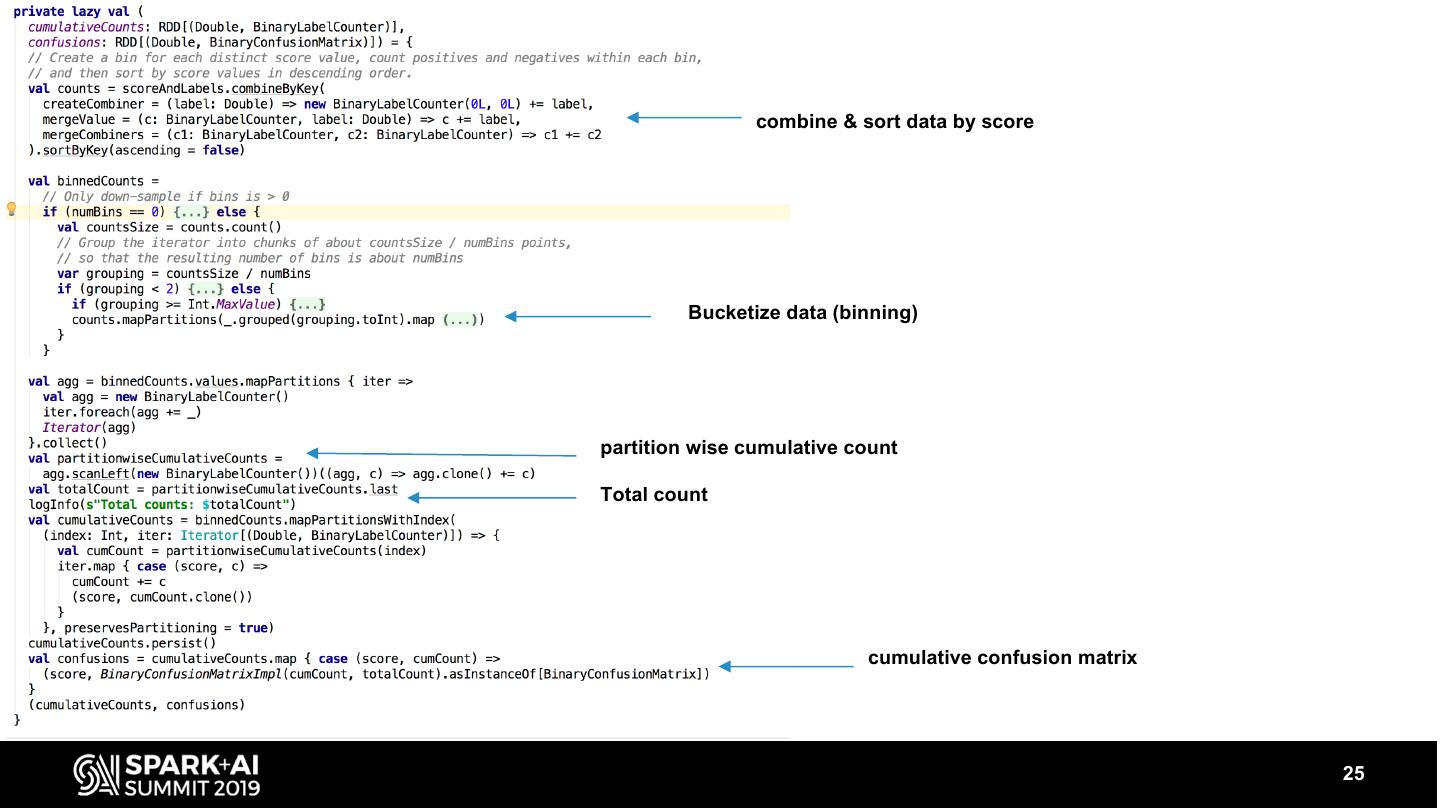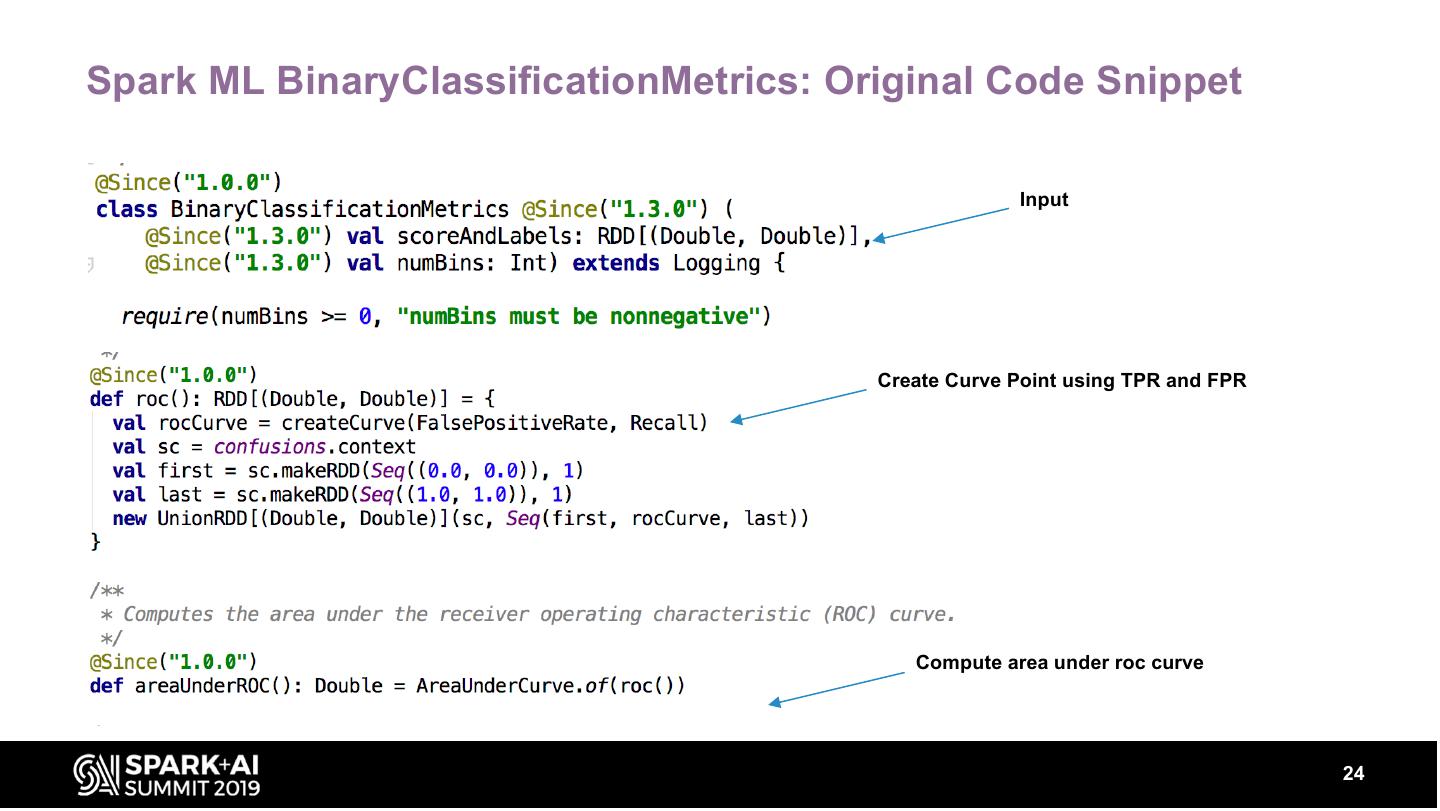 24 .Spark ML BinaryClassificationMetrics: Original Code Snippet Input Create Curve Point using TPR and FPR Compute area under roc curve 24