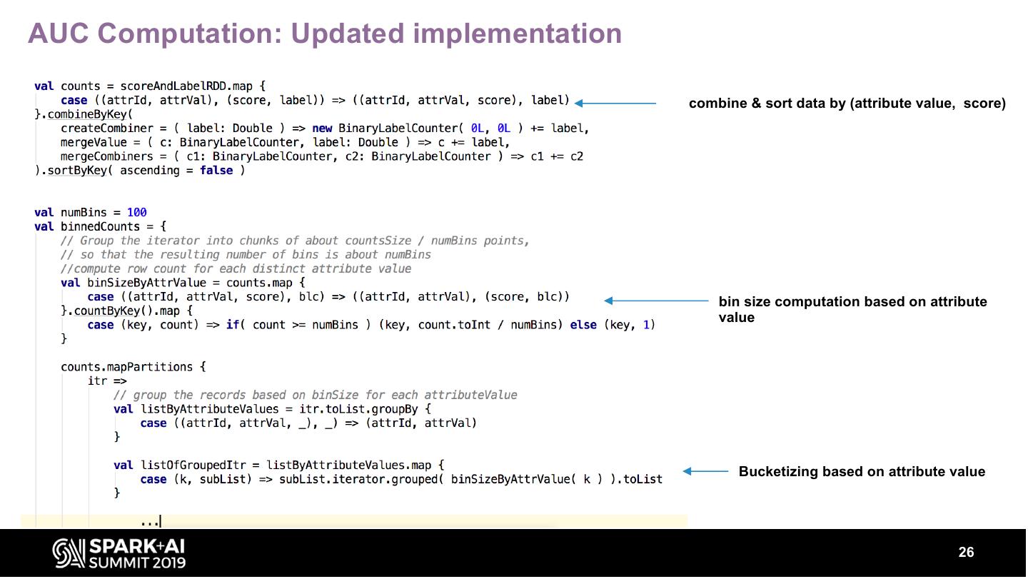 26 .AUC Computation: Updated implementation combine & sort data by (attribute value, score) bin size computation based on attribute value Bucketizing based on attribute value 26