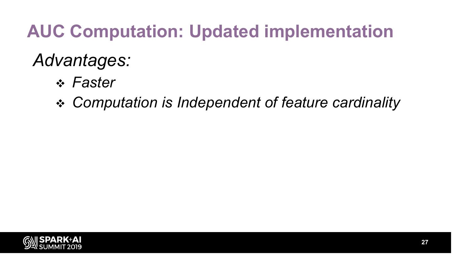 27 .AUC Computation: Updated implementation Advantages: v Faster v Computation is Independent of feature cardinality 27